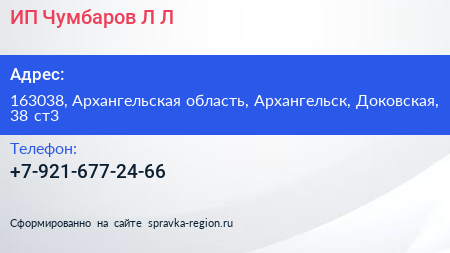 ИП Чумбаров Л.Л. по адресу 163038, Архангельская область, Архангельск, Доковская, 38 ст3 в дальнейшем Организация, размещена в следующих категориях: