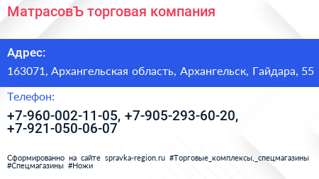 МатрасовЪ, торговая компания по адресу 163071, Архангельская область, Архангельск, Гайдара, 55 в дальнейшем Организация, размещена в следующих категориях:
