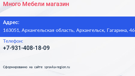 Много Мебели, магазин по адресу 163051, Архангельская область, Архангельск, Гагарина, 46 в дальнейшем Организация, размещена в следующих категориях: