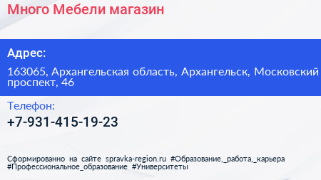 Много Мебели, магазин по адресу 163065, Архангельская область, Архангельск, Московский проспект, 46 в дальнейшем Организация, размещена в следующих категориях: