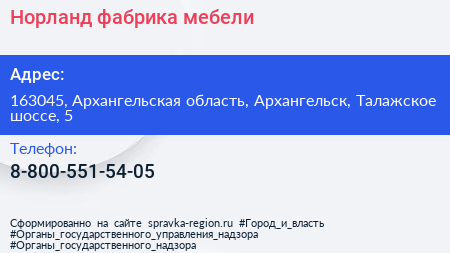 Норланд, фабрика мебели по адресу 163045, Архангельская область, Архангельск, Талажское шоссе, 5 в дальнейшем Организация, размещена в следующих категориях: