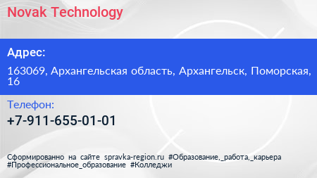 Novak Technology по адресу 163069, Архангельская область, Архангельск, Поморская, 16 в дальнейшем Организация, размещена в следующих категориях: