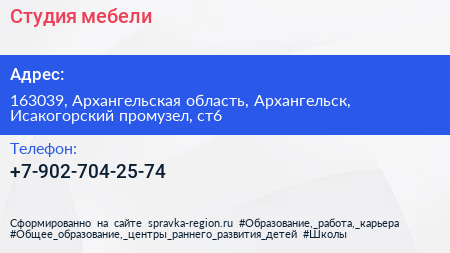 Студия мебели по адресу 163039, Архангельская область, Архангельск, Исакогорский промузел, ст6 в дальнейшем Организация, размещена в следующих категориях: