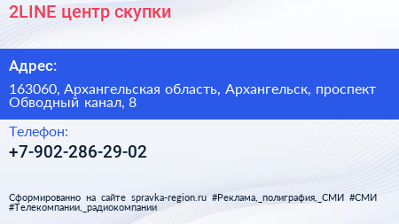 2LINE, центр скупки по адресу 163060, Архангельская область, Архангельск, проспект Обводный канал, 8 в дальнейшем Организация, размещена в следующих категориях: