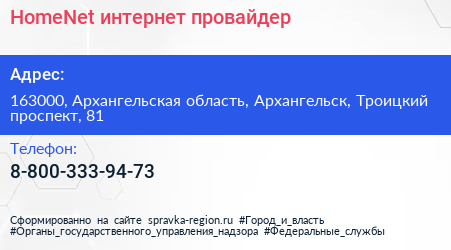 HomeNet, интернет-провайдер по адресу 163000, Архангельская область, Архангельск, Троицкий проспект, 81 в дальнейшем Организация, размещена в следующих категориях: