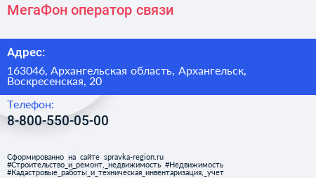 МегаФон, оператор связи по адресу 163046, Архангельская область, Архангельск, Воскресенская, 20 в дальнейшем Организация, размещена в следующих категориях: