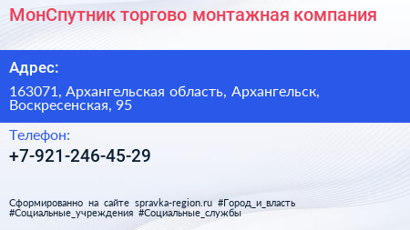 МонСпутник, торгово-монтажная компания по адресу 163071, Архангельская область, Архангельск, Воскресенская, 95 в дальнейшем Организация, размещена в следующих категориях: