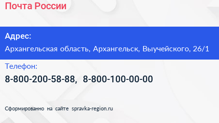 Почта России по адресу Архангельская область, Архангельск, Выучейского, 26/1 в дальнейшем Организация, размещена в следующих категориях: