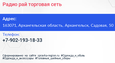 Радио-рай, торговая сеть по адресу 163071, Архангельская область, Архангельск, Садовая, 50 в дальнейшем Организация, размещена в следующих категориях: