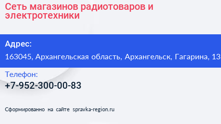 Сеть магазинов радиотоваров и электротехники по адресу 163045, Архангельская область, Архангельск, Гагарина, 13 в дальнейшем Организация, размещена в следующих категориях:
