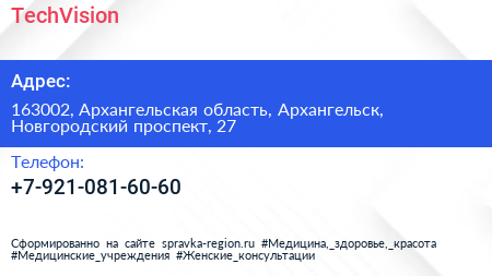 TechVision по адресу 163002, Архангельская область, Архангельск, Новгородский проспект, 27 в дальнейшем Организация, размещена в следующих категориях: