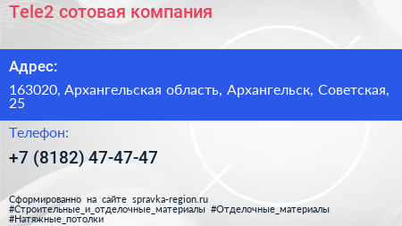 Tele2, сотовая компания по адресу 163020, Архангельская область, Архангельск, Советская, 25 в дальнейшем Организация, размещена в следующих категориях: