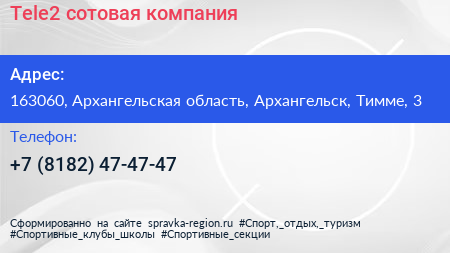 Tele2, сотовая компания по адресу 163060, Архангельская область, Архангельск, Тимме, 3 в дальнейшем Организация, размещена в следующих категориях: