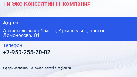 Ти Экс Консалтин, IT-компания по адресу Архангельская область, Архангельск, проспект Ломоносова, 81 в дальнейшем Организация, размещена в следующих категориях: