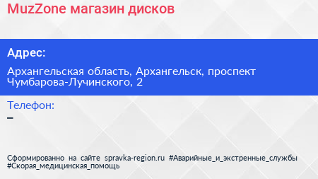 MuzZone, магазин дисков по адресу Архангельская область, Архангельск, проспект Чумбарова-Лучинского, 2 в дальнейшем Организация, размещена в следующих категориях: