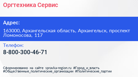 Оргтехника-Сервис по адресу 163000, Архангельская область, Архангельск, проспект Ломоносова, 117 в дальнейшем Организация, размещена в следующих категориях:
