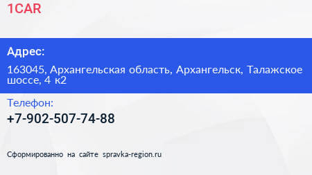 1CAR по адресу 163045, Архангельская область, Архангельск, Талажское шоссе, 4 к2 в дальнейшем Организация, размещена в следующих категориях: