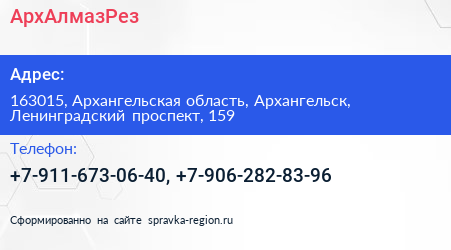 АрхАлмазРез по адресу 163015, Архангельская область, Архангельск, Ленинградский проспект, 159 в дальнейшем Организация, размещена в следующих категориях: