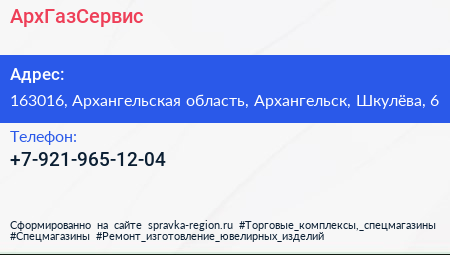 АрхГазСервис по адресу 163016, Архангельская область, Архангельск, Шкулёва, 6 в дальнейшем Организация, размещена в следующих категориях: