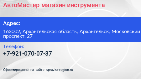 АвтоМастер, магазин инструмента по адресу 163002, Архангельская область, Архангельск, Московский проспект, 27 в дальнейшем Организация, размещена в следующих категориях: