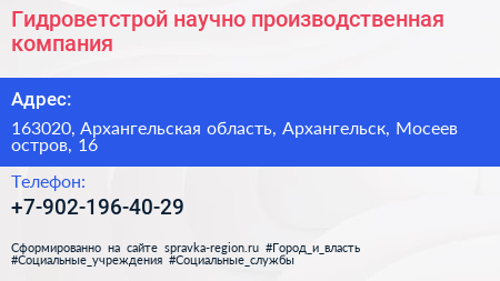 Гидроветстрой, научно-производственная компания по адресу 163020, Архангельская область, Архангельск, Мосеев остров, 16 в дальнейшем Организация, размещена в следующих категориях: