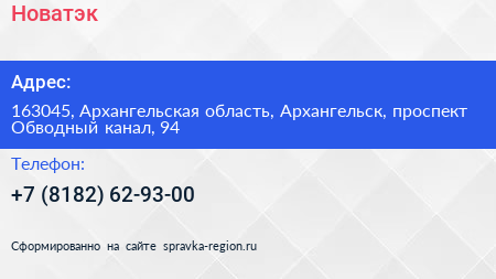 Новатэк по адресу 163045, Архангельская область, Архангельск, проспект Обводный канал, 94 в дальнейшем Организация, размещена в следующих категориях: