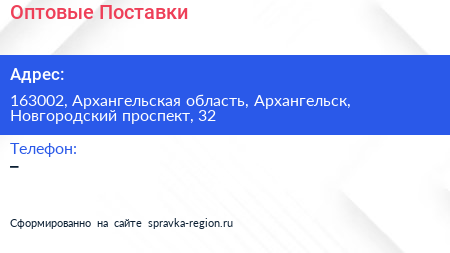 Оптовые Поставки по адресу 163002, Архангельская область, Архангельск, Новгородский проспект, 32 в дальнейшем Организация, размещена в следующих категориях:
