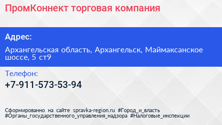 ПромКоннект, торговая компания по адресу Архангельская область, Архангельск, Маймаксанское шоссе, 5 ст9 в дальнейшем Организация, размещена в следующих категориях: