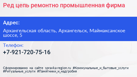 Ред-цепь, ремонтно-промышленная фирма по адресу Архангельская область, Архангельск, Маймаксанское шоссе, 5 в дальнейшем Организация, размещена в следующих категориях: