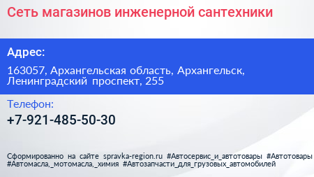 Сеть магазинов инженерной сантехники по адресу 163057, Архангельская область, Архангельск, Ленинградский проспект, 255 в дальнейшем Организация, размещена в следующих категориях: