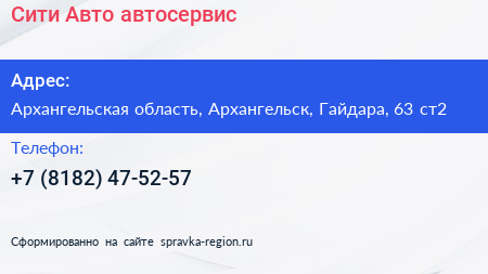 Сити Авто, автосервис по адресу Архангельская область, Архангельск, Гайдара, 63 ст2 в дальнейшем Организация, размещена в следующих категориях: