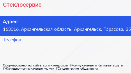 Стеклосервис по адресу 163016, Архангельская область, Архангельск, Тарасова, 35 в дальнейшем Организация, размещена в следующих категориях: