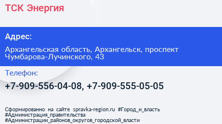 ТСК-Энергия по адресу Архангельская область, Архангельск, проспект Чумбарова-Лучинского, 43 в дальнейшем Организация, размещена в следующих категориях:
