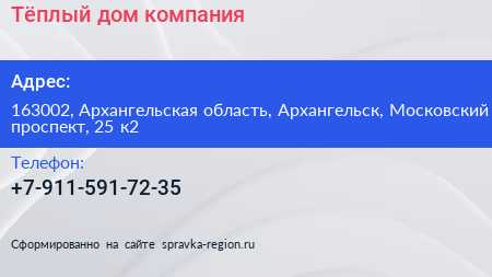 Тёплый дом, компания по адресу 163002, Архангельская область, Архангельск, Московский проспект, 25 к2 в дальнейшем Организация, размещена в следующих категориях: