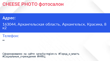 CHEESE PHOTO, фотосалон по адресу 163044, Архангельская область, Архангельск, Красина, 8 к2 в дальнейшем Организация, размещена в следующих категориях: