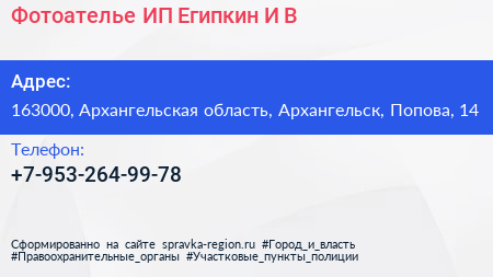 Фотоателье, ИП Египкин И.В. по адресу 163000, Архангельская область, Архангельск, Попова, 14 в дальнейшем Организация, размещена в следующих категориях: