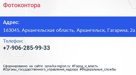 Фотоконтора по адресу 163045, Архангельская область, Архангельск, Гагарина, 2а в дальнейшем Организация, размещена в следующих категориях: