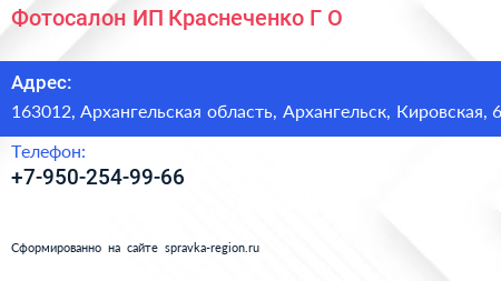 Фотосалон, ИП Краснеченко Г.О. по адресу 163012, Архангельская область, Архангельск, Кировская, 6 в дальнейшем Организация, размещена в следующих категориях:
