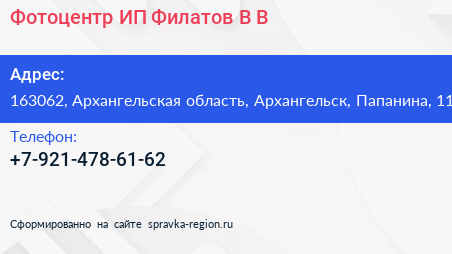 Фотоцентр, ИП Филатов В.В. по адресу 163062, Архангельская область, Архангельск, Папанина, 11 в дальнейшем Организация, размещена в следующих категориях: