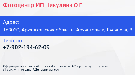 Фотоцентр, ИП Никулина О.Г. по адресу 163030, Архангельская область, Архангельск, Русанова, 8 в дальнейшем Организация, размещена в следующих категориях: