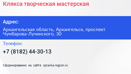 Клякса, творческая мастерская по адресу Архангельская область, Архангельск, проспект Чумбарова-Лучинского, 30 в дальнейшем Организация, размещена в следующих категориях:
