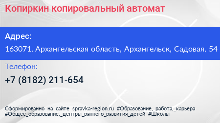 Копиркин, копировальный автомат по адресу 163071, Архангельская область, Архангельск, Садовая, 54 в дальнейшем Организация, размещена в следующих категориях: