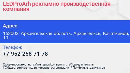 LEDProArh, рекламно-производственная компания по адресу 163002, Архангельская область, Архангельск, Касаткиной, 13 в дальнейшем Организация, размещена в следующих категориях: