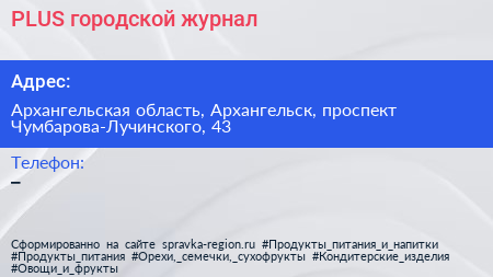 PLUS, городской журнал по адресу Архангельская область, Архангельск, проспект Чумбарова-Лучинского, 43 в дальнейшем Организация, размещена в следующих категориях: