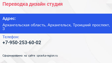 Переводка, дизайн-студия по адресу Архангельская область, Архангельск, Троицкий проспект, 3 в дальнейшем Организация, размещена в следующих категориях: