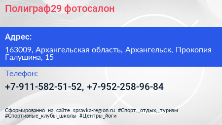 Полиграф29, фотосалон по адресу 163009, Архангельская область, Архангельск, Прокопия Галушина, 15 в дальнейшем Организация, размещена в следующих категориях: