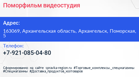 Поморфильм, видеостудия по адресу 163069, Архангельская область, Архангельск, Поморская, 5 в дальнейшем Организация, размещена в следующих категориях: