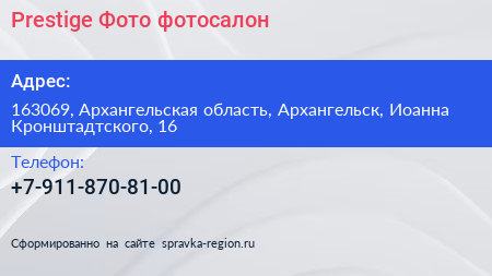 Prestige Фото, фотосалон по адресу 163069, Архангельская область, Архангельск, Иоанна Кронштадтского, 16 в дальнейшем Организация, размещена в следующих категориях: