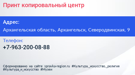 Принт, копировальный центр по адресу Архангельская область, Архангельск, Северодвинская, 9 в дальнейшем Организация, размещена в следующих категориях: