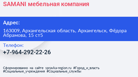 SAMANI, мебельная компания по адресу 163009, Архангельская область, Архангельск, Фёдора Абрамова, 15 ст5 в дальнейшем Организация, размещена в следующих категориях: